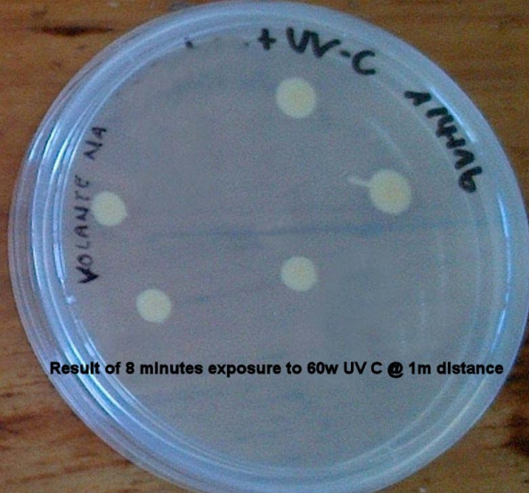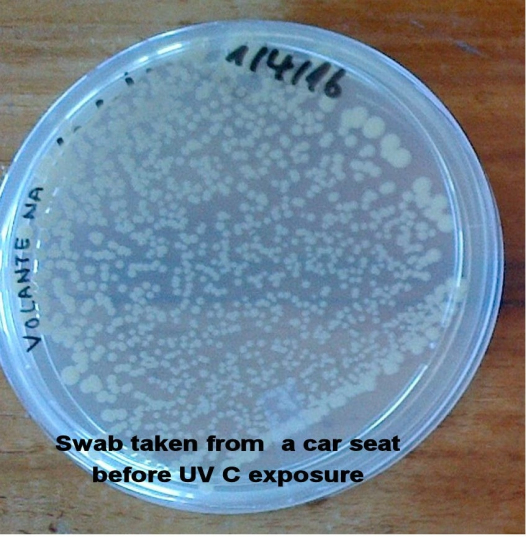 The 2 photos of  petri dishes were swabs taken from a car seat before exposure to 60watts of UVC and after only 8 minutes exposure, cultivated by the Micro Biology department University of Petermaritzburg KZN